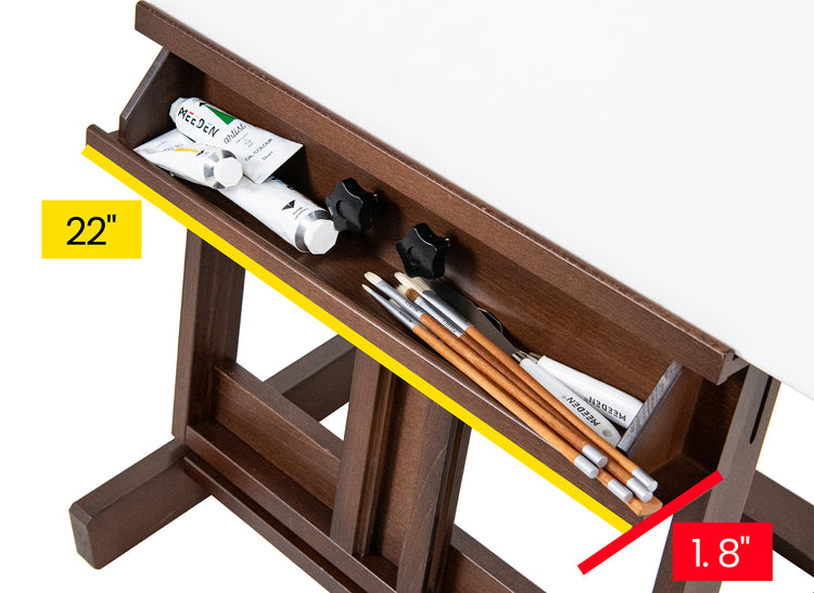- Adjustable Standing Floor Easel - Features an adjustable angle, allowing full vertical incline for pastel and portrait work. The center canvas tray lowers nearly to the floor, making it easy to work on details while sitting or standing.