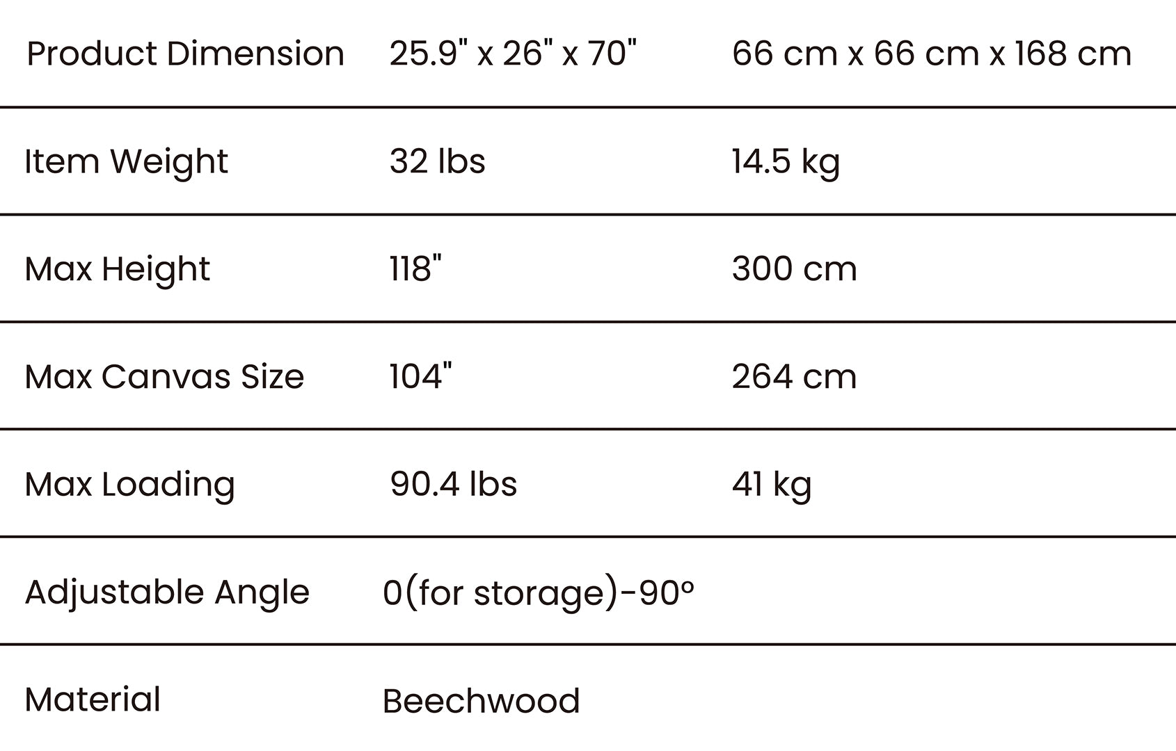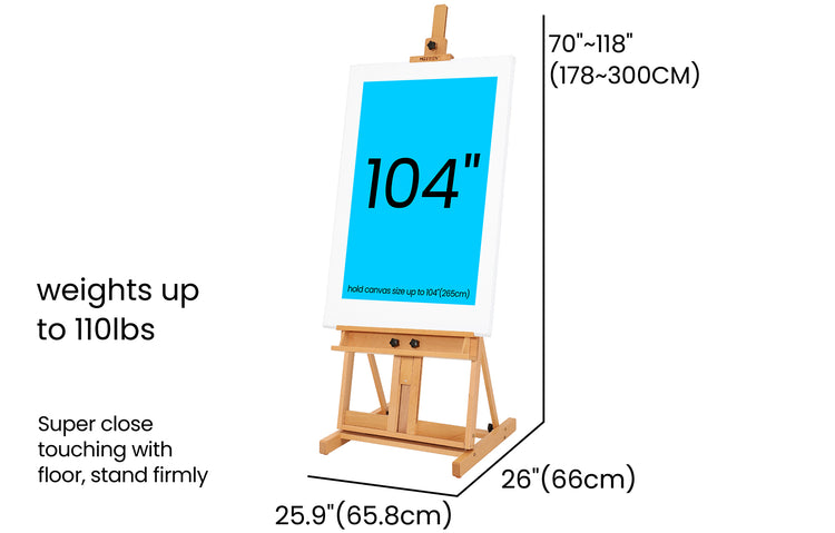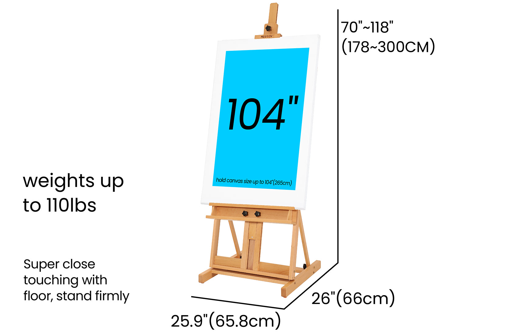 Stability: The H-frame design ensures exceptional stability. Featuring a four-row wooden base and a double-thick central column, it securely supports large canvases up to 104" and 90 lbs. This durable easel is ideal for both painting and displaying artwork.