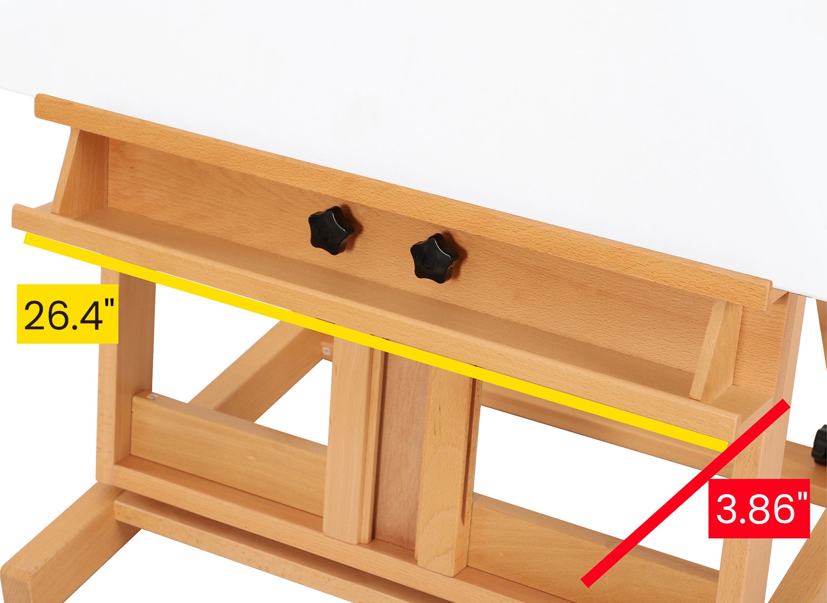Flexibility: The adjustable canvas holders move up and down to suit sitting or standing positions, with tiltable adjustments via rear leg knobs. A convenient ledge on the bottom holder keeps paint tubes and brushes within reach. Its compact design is perfect for tight spaces, offering an optimal angle for a pleasant painting experience.